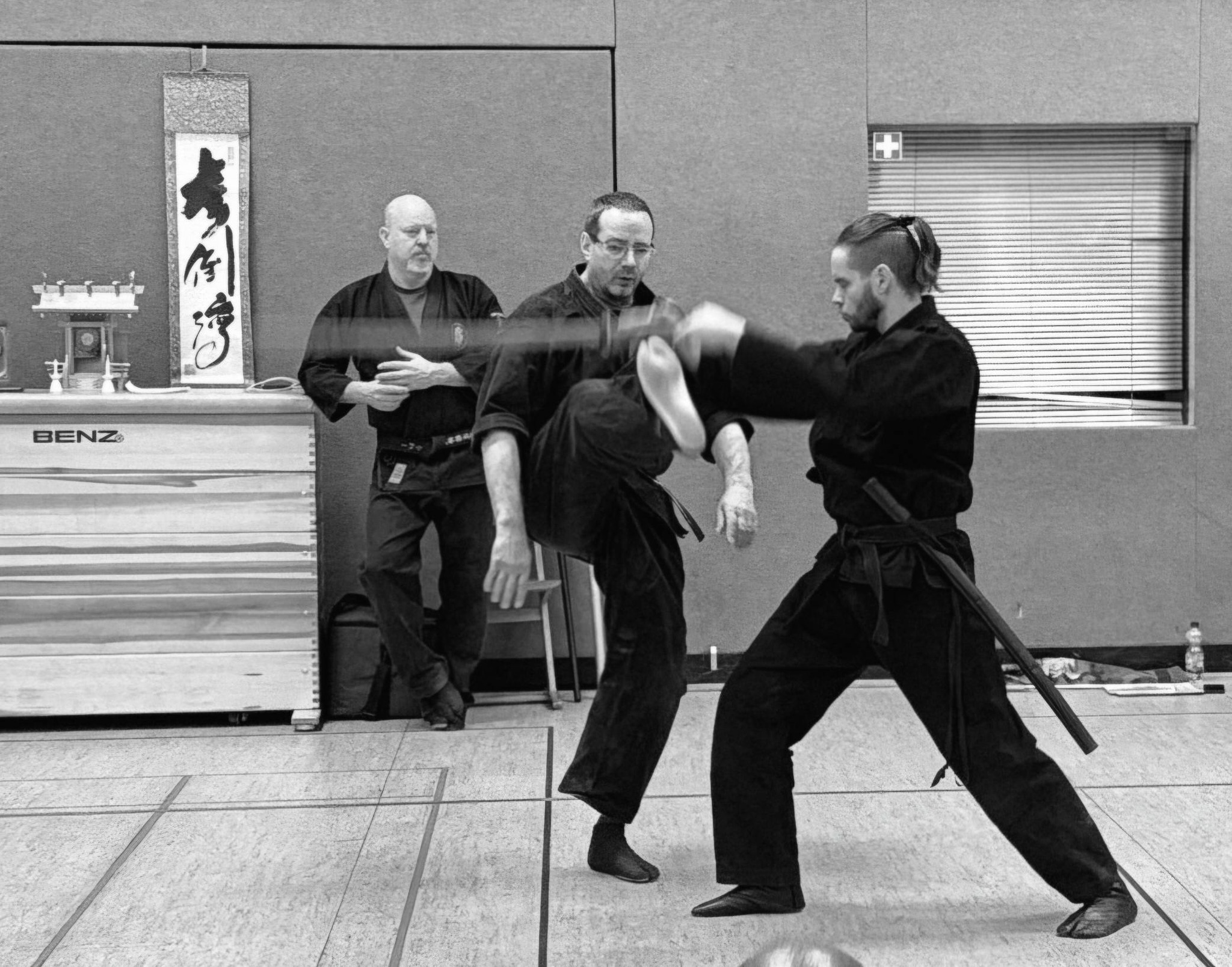 Am 22.03.2026 durften wir zum 5. Mal Jürgen Bieber bei uns im Dojo begrüßen. Dieses Mal war es ein ganz besonderes Seminar, denn Jürgen widmete sich dem Thema „Hyōshi o seishite, sen no toru“ oder zu Deutsch: „Indem man den Rhythmus kontrolliert, erlangt man die Initiative“. Klingt erstmal sehr abstrakt und theoretisch… Wenn man jedoch Jürgen in Aktion erlebt, und seinen sehr systematischen Erklärungen lauscht, eröffnen sich Einem völlig neue Einblicke in die Möglichkeiten des Budo. Es ist schon verdammt schwierig, Konzepte wie Timing und Rhytmus überhaupt zu verstehen. Sie dann auch noch systematisch und reproduzierbar in ein Bewegungsmuster zu übertragen, ist dann wohl die höhste Kunst, die nur Einzelnen vorbehalten bleibt. Es ist für einen Kampfkünstler wohl genauso schwierig „Rhytmus“ zu erklären, wie für einen Musiker einen 3/4 Takt mit Worten zu beschreiben. Erstaunlicher-weise ist es tatsächlich mit sehr sehr viel Übung möglich, den Rhytmus des Gegners zu erspüren und damit seine Bewegung zu erraten und vorherzusagen. Noch erstaunlicher ist es, dass man diese Fähigkeit benutzen kann, um den eigenen Rhytmus jemandem aufzuzwingen und ihn damit wie von Zauberhand zu lenken und in eine Richtung zu steuern. Das Spüren des Rhytmus ist eine fast mystische Fähigkeit, vielleicht zu vergleichen mit sehr aufeinander abgestimmten Team-sportlern, Piloten oder Fabrikarbeitern, die einen komplizierten Prozess gemeinsam durchführen. Ein Gefühl die Bewegung des anderen zu kennen, bevor er sie anfängt, zu fühlen wann sie anfängt und mit ihr mitzugehen, ohne nachzudenken. Vielleicht sind wir durch irgendeine Art Bio-Feld, wie Sender und Empfänger miteinander verbunden? Ich weiß es nicht, aber ich weiß wie es sich anfühlt, wenn es funktioniert. Und die nächste Stufe ist es, diese Bewegung in der Mitte zu unterbrechen und mit der eigenen Körperbewegung umzulenken, und zwar genau in dem Moment, wenn der andere nicht mehr anhalten kann. Hört sich an wie Quatsch? Ich glaube dass unsere Augen und Gehirne in der Lage sind viel mehr Details der Umgebung wahrzunehmen, als allgemein anerkannt wird. Vielleicht kennst du das Gefühl von hinten beobachtet zu werden, und wenn man sich umdreht, ist da tatsächlich ein fokussierter Blick von einer Person am anderen Ende des Raums. Dieses Gefühl wird als Skopaesthesie bezeichnet. Oder der Cocktailparty-Effekt, bei dem man sich in einer sehr lauten Umgebung genau auf eine einzelene Stimme fokussieren vermag. Jedenfalls ist es garnicht so wichtig „zu verstehen“. Wichtig ist es im Budo, die Fähigkeit den anderen zu lesen und zu lenken zu üben, zu verbessern und im richtigen Moment auch einzusetzen. Dieses Seminar hat allen vor Augen geführt, dass man diese Fähigkeit kontrolliert üben kann, denn Jürgen beherrscht sie auf einem extrem hohen Niveau. Es war wieder mal Blick hinter die Kulissen der reinen Katas, der Äußerlichkeiten – auf die wahre Essenz des Budo und die Fähigkeiten, die in uns allen verborgen schlummern.